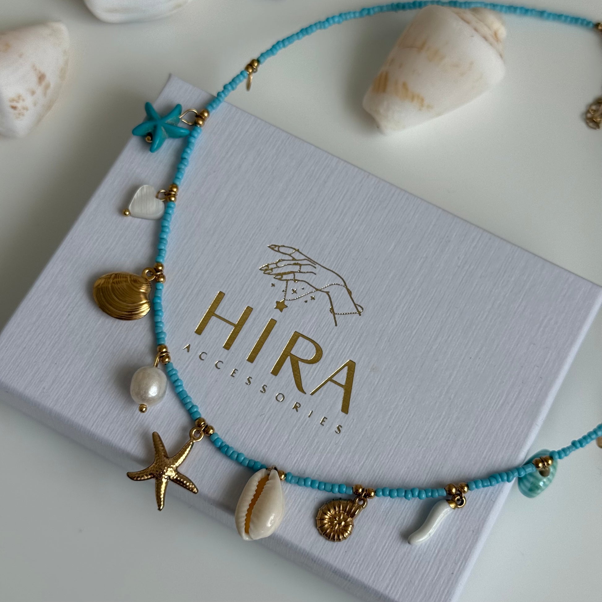 Die Ocean Breeze Charm Kette bringt das Gefühl von Sonne, Sand und Meer direkt an deinen Hals. Feine türkisfarbene Perlen und kleine maritime Anhänger wie Seestern, Muschel, Herz und Koralle machen dieses Schmuckstück zu einem echten Sommerhighlight.