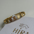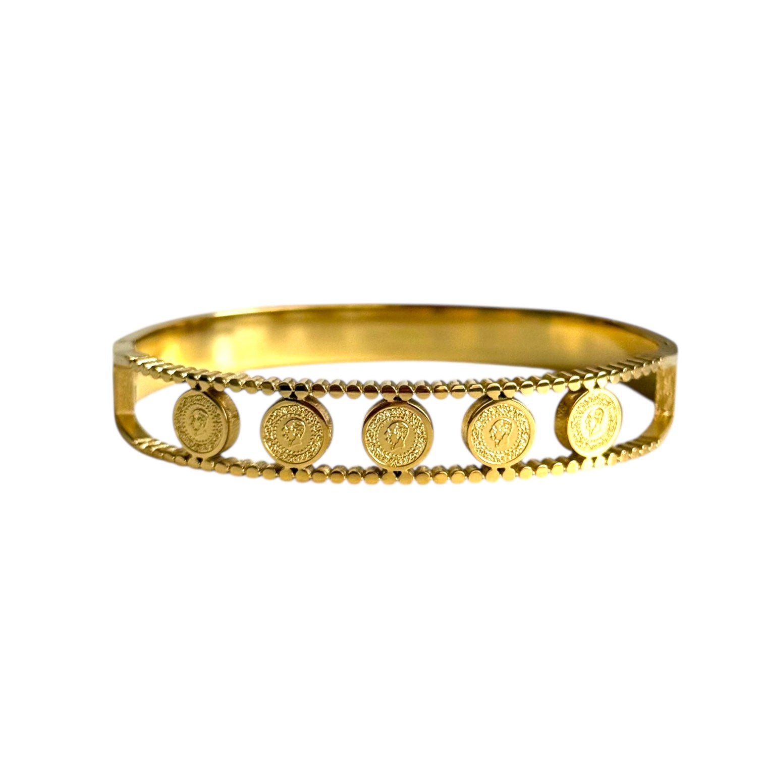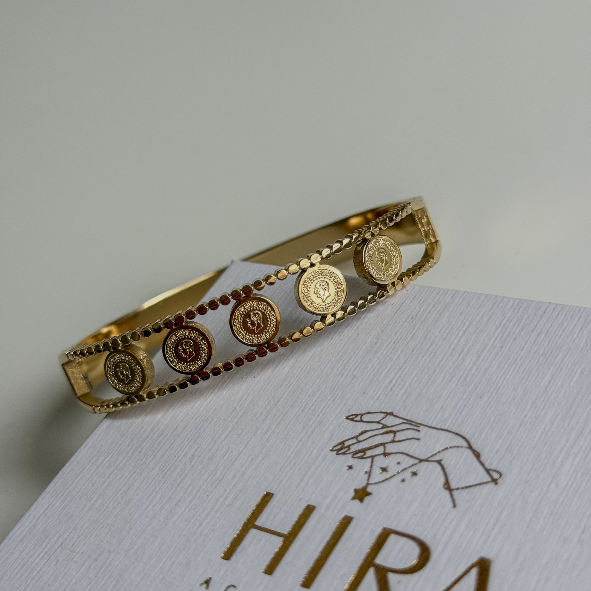 Der Mini Çeyrek Armreif ist aus hochwertigem, vergoldetem Edelstahl gefertigt und überzeugt mit seinem besonderen Design. Die detailreichen „Mini Çeyrek“-Elemente sind kunstvoll eingearbeitet und von feinen Kugelverzierungen umrahmt. Das Ergebnis ist ein Armreif, der Tradition mit moderner Eleganz verbindet.