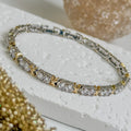 Fein geschliffene Zirkonsteine reihen sich aneinander und werden von zarten X-Details in 18K vergoldetem Edelstahl umschlossen, die sich elegant mit versilberten Gliedern abwechseln.