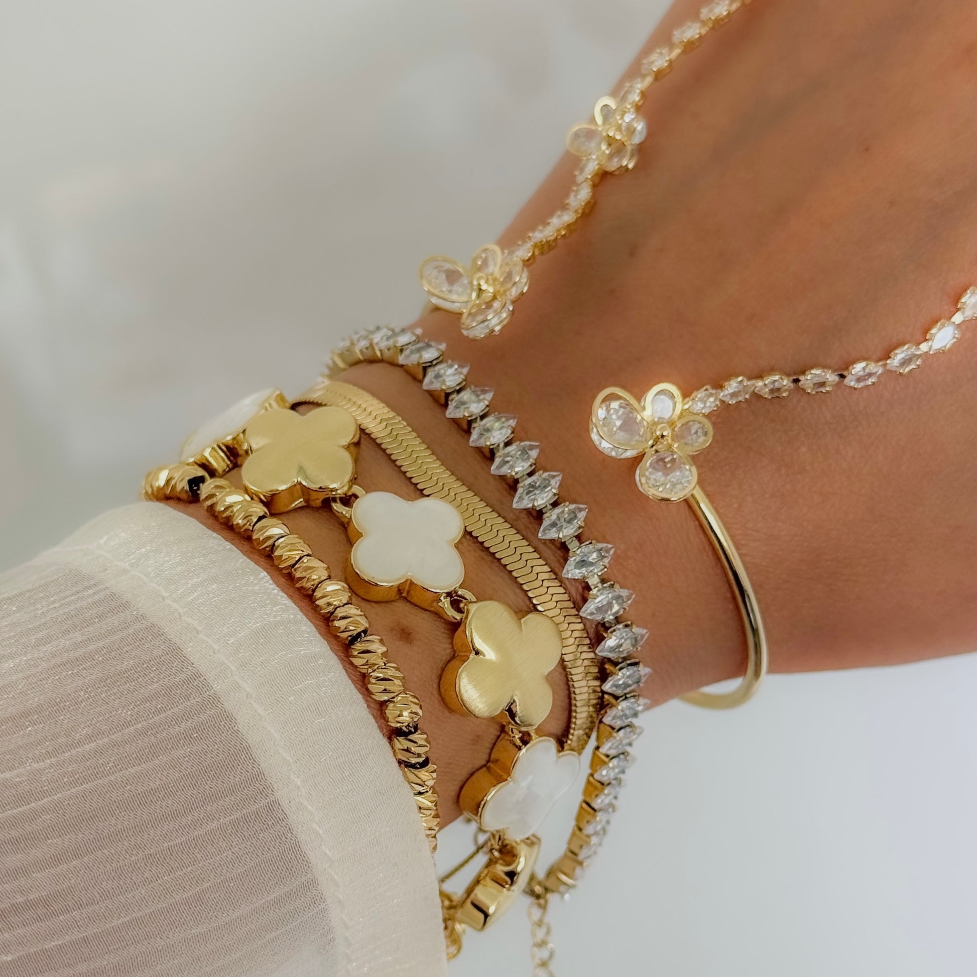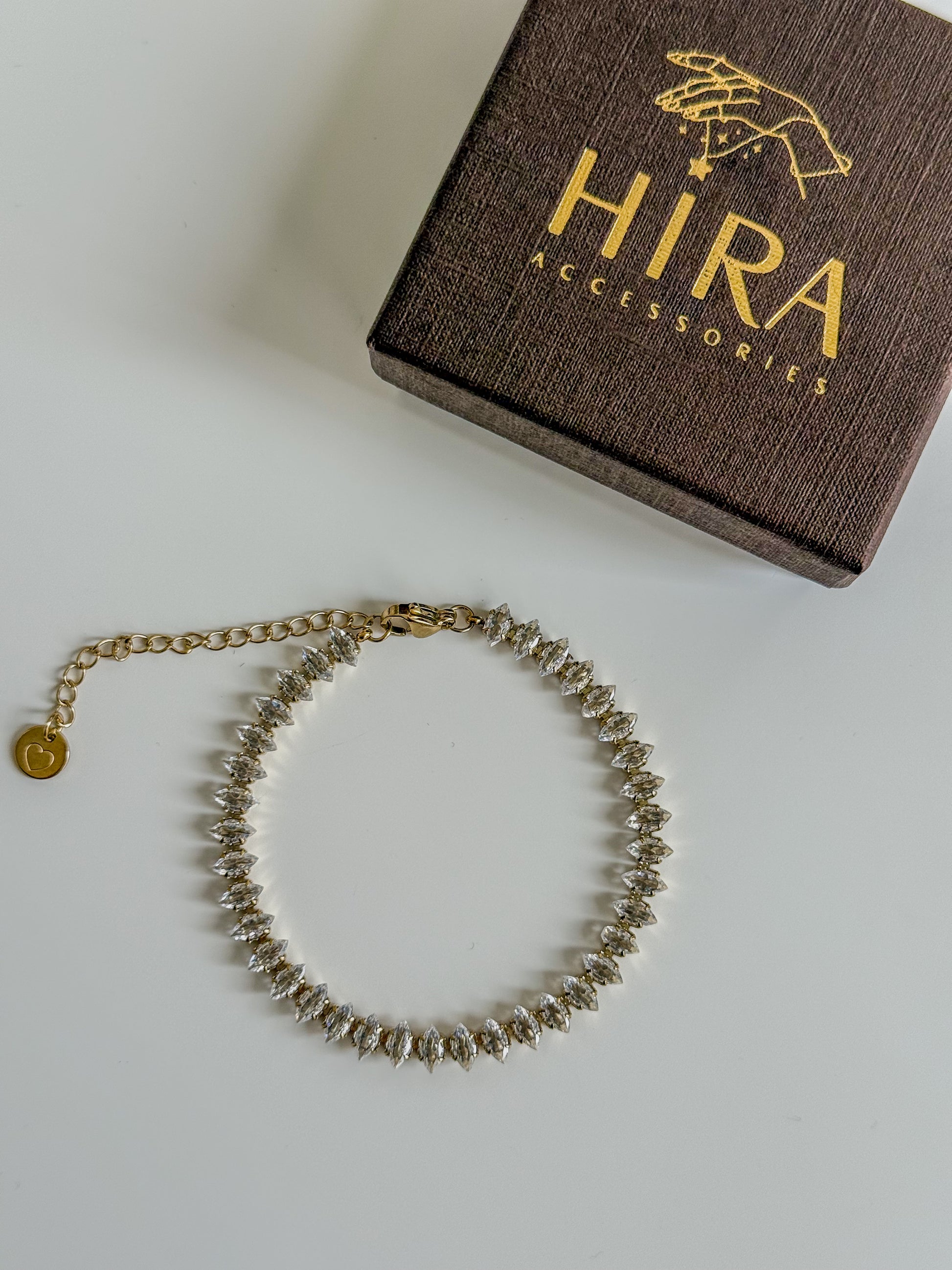 Tauche ein in die Welt des Glanzes mit unserem Kristall Funkel Armband. Jedes einzelne Zirkonia-Element funkelt im marquise-Schliff wie ein winziger Diamant und verleiht deinem Handgelenk einen Hauch von Luxus – perfekt für besondere Anlässe oder als stilvolles Alltagsstück.