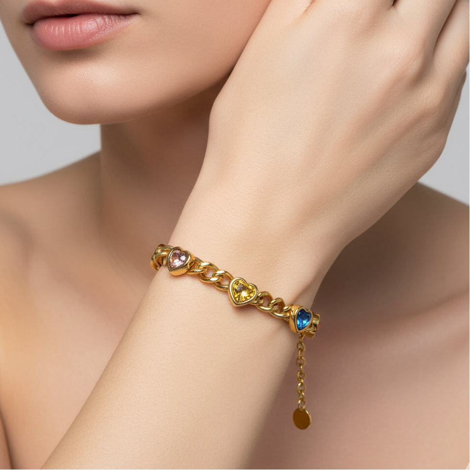 Ein verspieltes Statement aus Farbe und Glanz – das Rainbow Hearts Armband verleiht deinem Look einen Hauch Freude und Liebe. Fünf funkelnde Herzanhänger in zarten Regenbogenfarben tanzen auf einer goldfarbenen Gliederkette und bringen Leichtigkeit und Eleganz in dein Schmuckstyling.